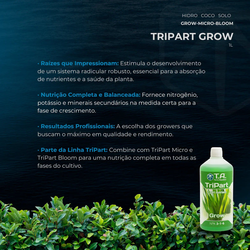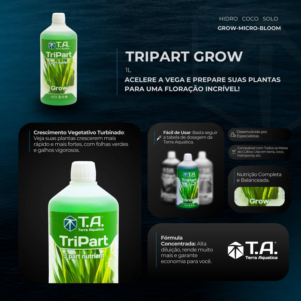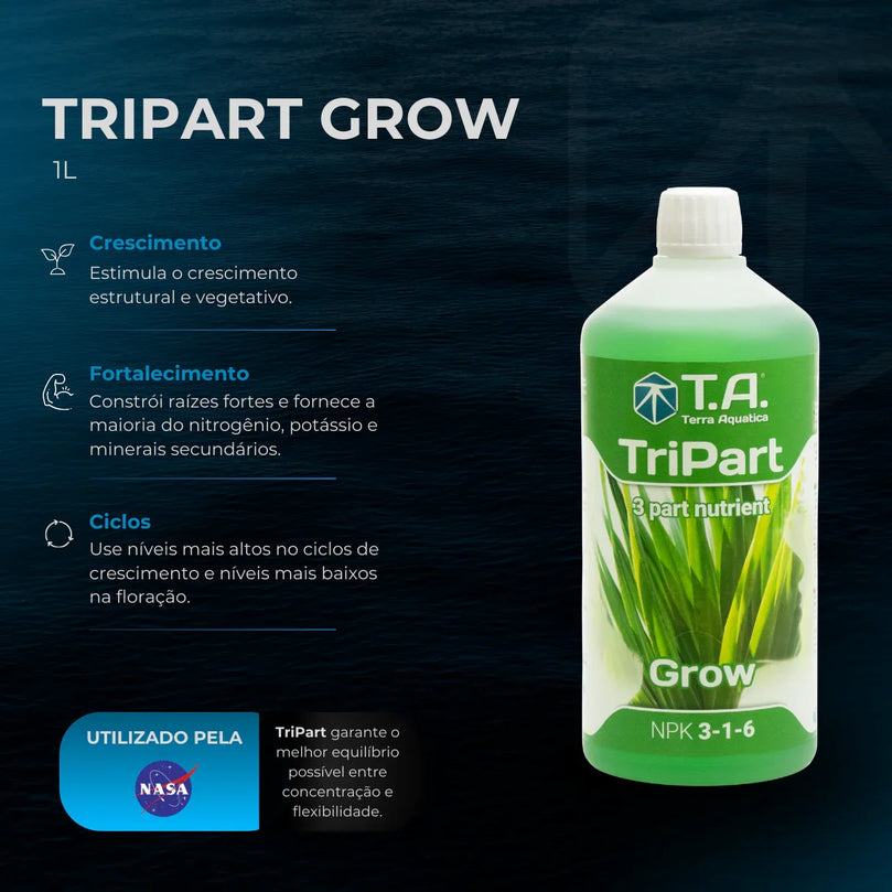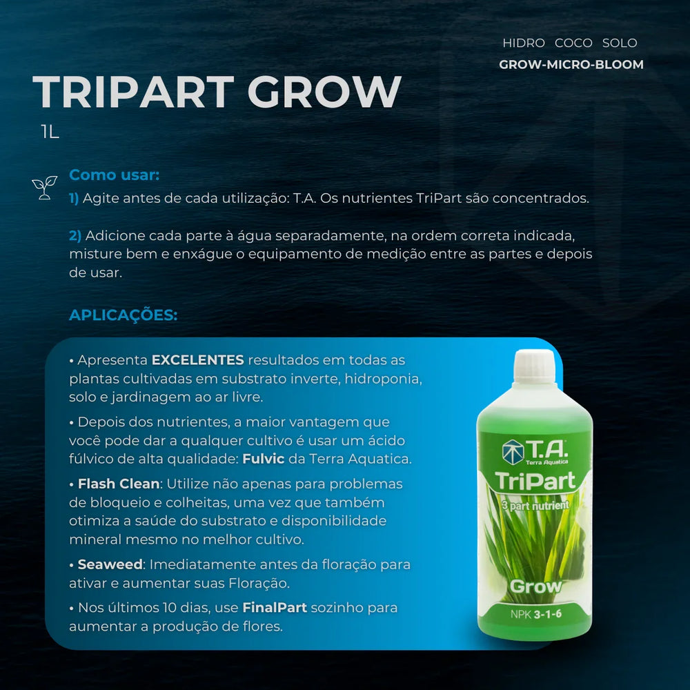 TriPart Grow ®: Estimula o crescimento estrutural e vegetativo, constrói raízes fortes e fornece a maioria do nitrogênio, potássio e minerais secundários na Linha TriPart. Use níveis mais altos no ciclos de crescimento e níveis mais baixos na floração.