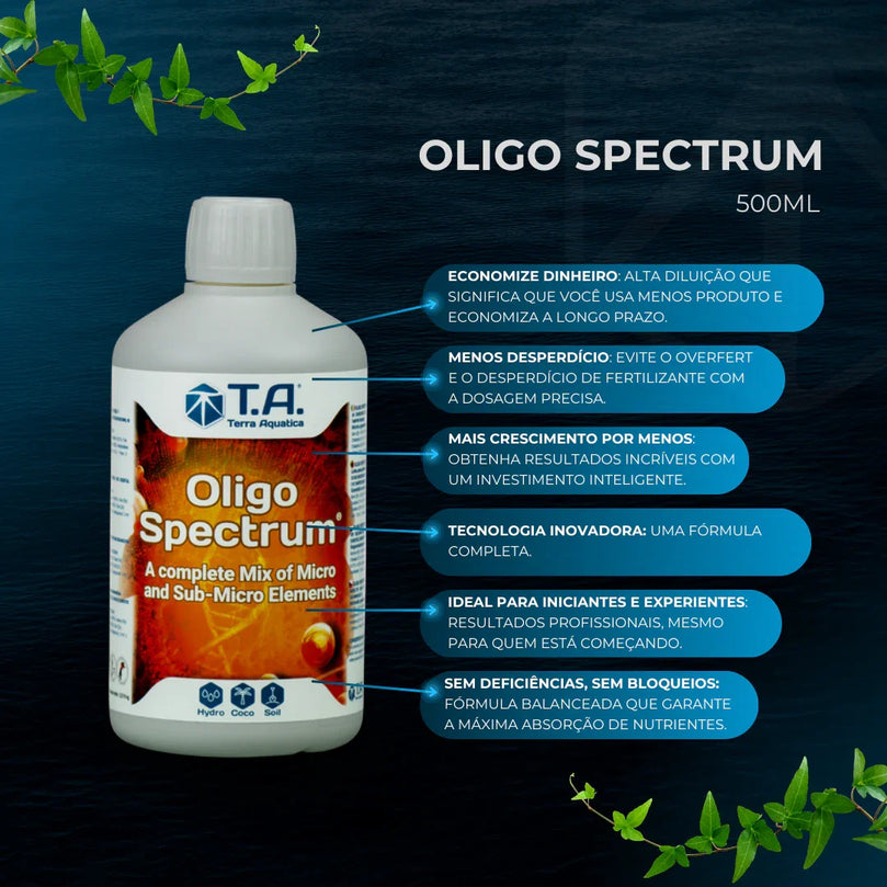 Oligo Spectrum ® é um produto único: uma gama abrangente de micronutrientes concentrados na forma quelatada, além de sub-micro elementos essenciais aplicados com solução tampão orgânica. É utilizado como complemento a solução nutritiva em culturas no solo e na água, bem como na pulverização foliar em situações onde a adição de metal à água pode apresentar problemas como na Aquaponia.