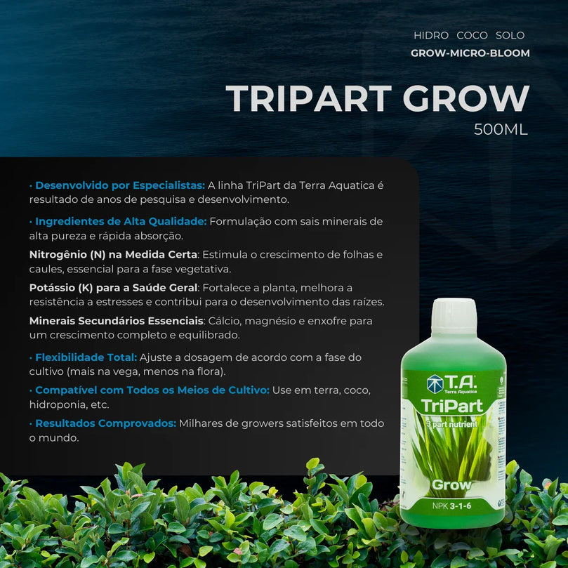 TriPart Grow ®: Estimula o crescimento estrutural e vegetativo, constrói raízes fortes e fornece a maioria do nitrogênio, potássio e minerais secundários na Linha TriPart. Use níveis mais altos no ciclos de crescimento e níveis mais baixos na floração.