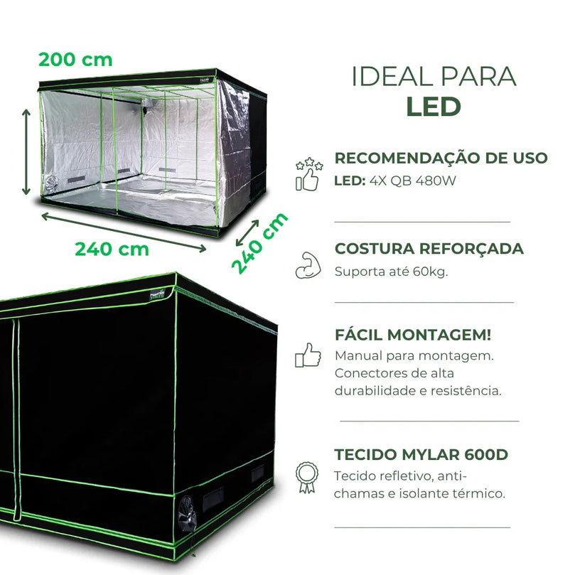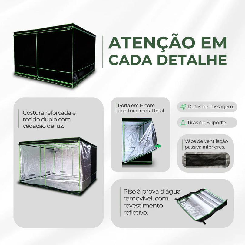 Sim, a montagem é bem simples e intuitiva, acompanhada de instruções. A estrutura é feita de alumínio reforçado com conexões metálicas, garantindo resistência e estabilidade mesmo com uso frequente. O tecido Mylar 600D é extra grosso, anti-chamas, com costuras reforçadas e zíper vedante de luz, além do piso removível à prova d’água — tudo para suportar vários ciclos de montagem, desmontagem e limpeza sem perder a qualidade.