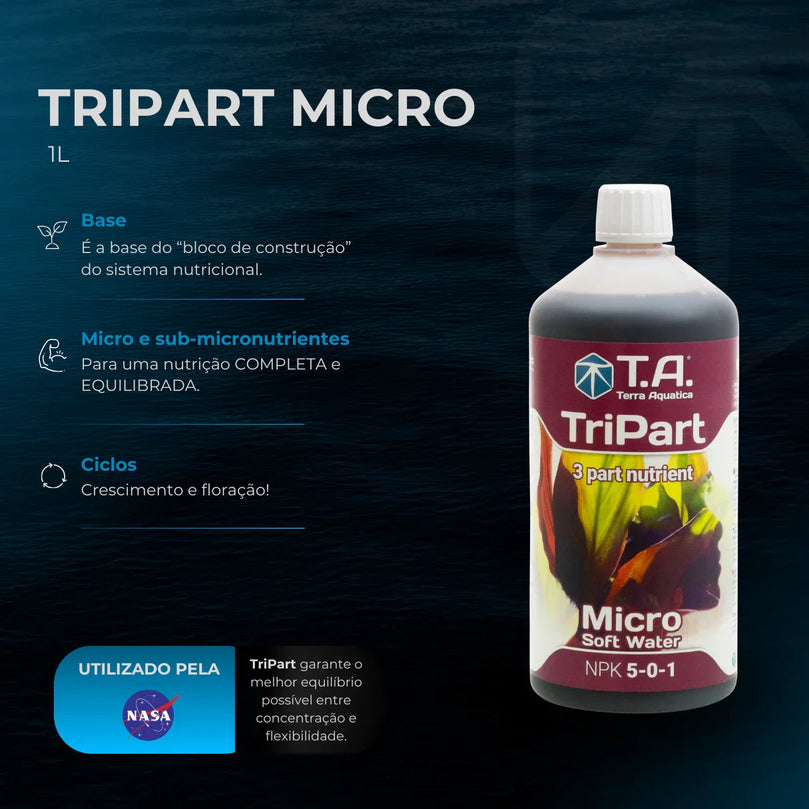 TriPart Micro ®: É a base do “bloco de construção” do sistema nutricional, fornecendo micro e sub-micro nutrientes, assim como alguns macronutrientes complementares. Usar TriPart Micro conforme indicado durante todo o crescimento e Floração.