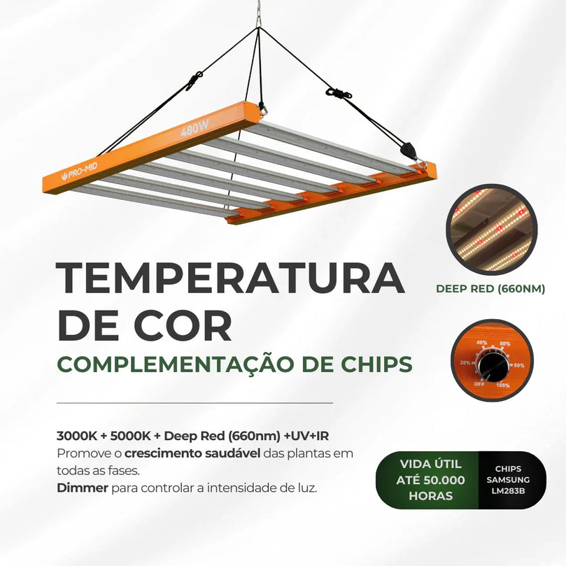 - Espectro completo: 3000K + 5000K + 660nm (ideal para todas as fases)