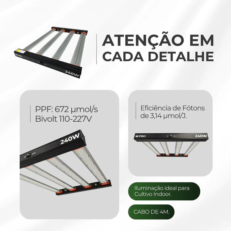 O painel Quantum 240W PRO BAR foi projetado para proporcionar um espectro completo de luz, otimizando o crescimento e a floração das plantas. Equipado com chips Samsung LM301H EVO, Deep Red Osram (660nm) e Deep Blue (450nm), é perfeito para quem busca alta eficiência e qualidade de cultivo. O Driver Master Plants garante desempenho e estabilidade.