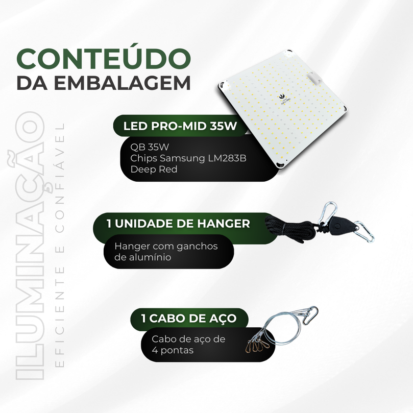 Mesmo que no futuro você faça upgrade para painéis mais potentes, a sua 35W PRO-MID continua sendo extremamente útil. Perfeita para mudas, clones ou apoio em um espaço separado, ela se torna um acessório indispensável para qualquer cultivador.