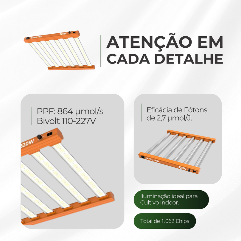 A Quantum Barra 320W PRO-MID é a iluminação profissional que transforma o desempenho do seu cultivo indoor.