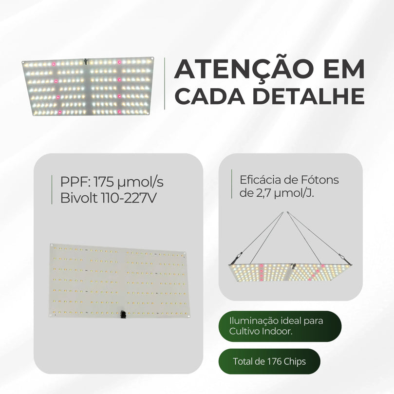 Equipada com um total de 176 chips Samsung LM281B, reconhecidos por sua eficiência e durabilidade no mercado, com Deep Red (660nm) para otimizar a floração.