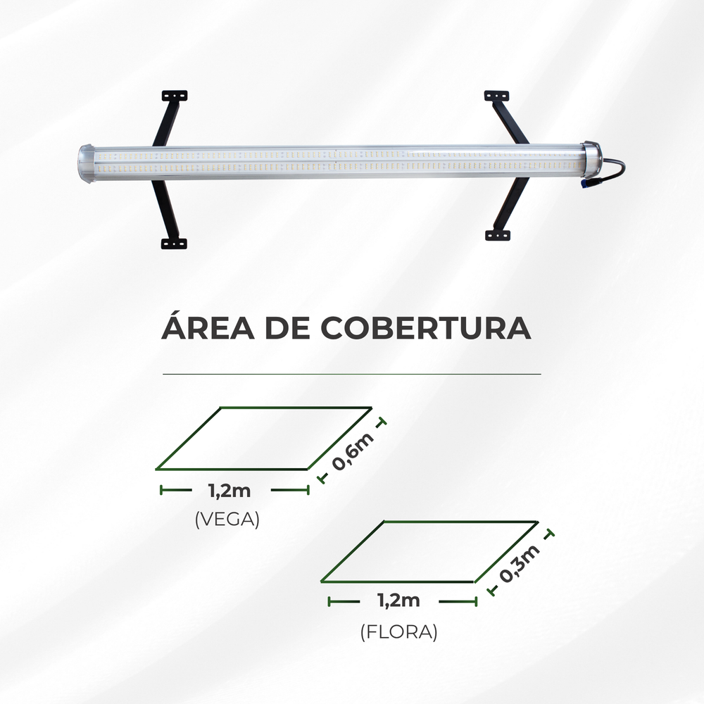 - Área de cobertura: Vegetativo 1,2 × 0,6 m / Floração 1,2 × 0,3 m